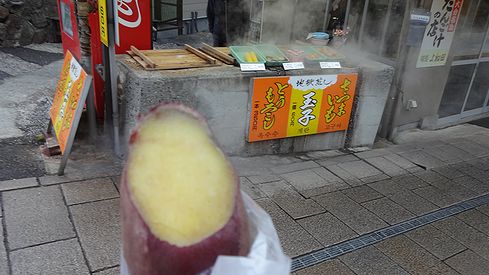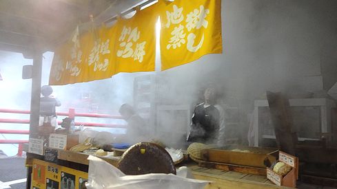 さて、みゆき坂を上がって行きましょう。途中、別府名物の地獄蒸しの売店がありました。地獄蒸しとは、源泉から出てくる蒸気を利用し卵や野菜などを蒸したもので、昔から利用されてきました。さつまいもの地獄蒸しを頂きます。しっとりしていて、甘くて、大変美味でした。