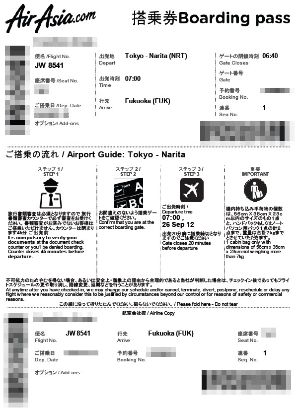 今回は日帰り旅行で荷物もなかったので、ウェブチェックインを利用しました。 ウェブで手続きを済ませると、左のような搭乗券のPDFが表示されます。それをプリントアウトして、当日セキュリティチェックに提示するだけで飛行機に乗れました。