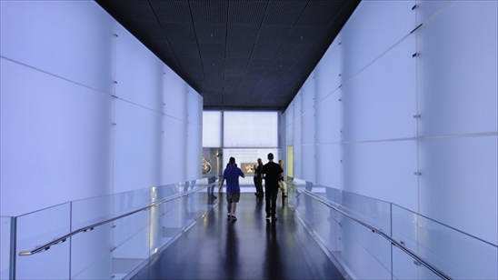 ミュージアムの内部はこのような感じです。通路両側の壁が淡く白く光り、まるで異次元へと吸い込まれていくかのようです。