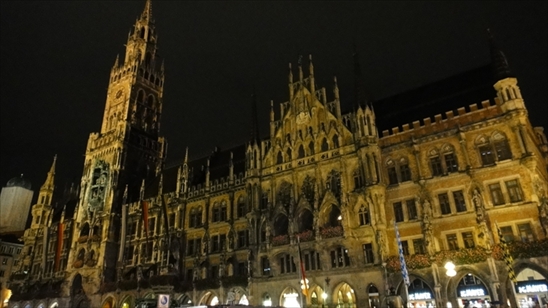 ライトアップされた夜の新市庁舎は、幻想的な美しさでした。この地下にレストランがあります。