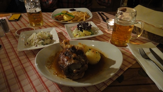 シュヴァインスハクセ(Schweinshaxe)をオーダーしました。シュヴァインスハクセとは、豚の足をローストしたもので、バイエルン地方の名物料理です。