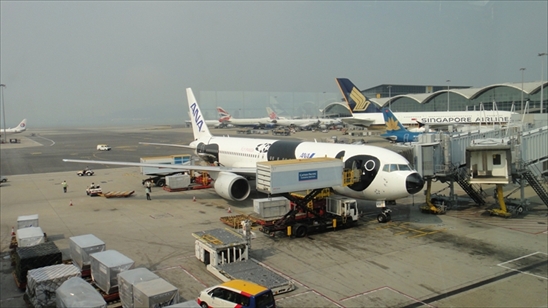 今回レポートするのは、NH910便香港→成田のビジネスクラス。エアージャパンの運航で、ボーイングB767-300型機のパンダジェットです。白黒模様が可愛いですね。