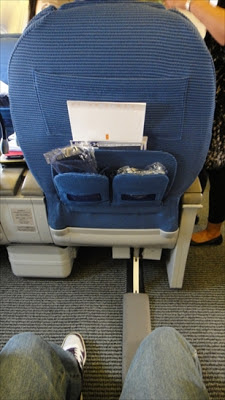 シートピッチはこれくらいです。このシートは残念ながらライフラットにはなりません。直前に乗ったアシアナの中距離ビジネスですと、普通にライフラットシートが投入されているのに比べると見劣りしてしまいます。