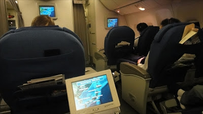 アブレストは、2-1-2という特徴的な配列。席は6割くらいは埋まっていたでしょうか。離陸後に真ん中の独立シートへ移動させてもらいました。パーソナルモニターが小さいのが残念です。