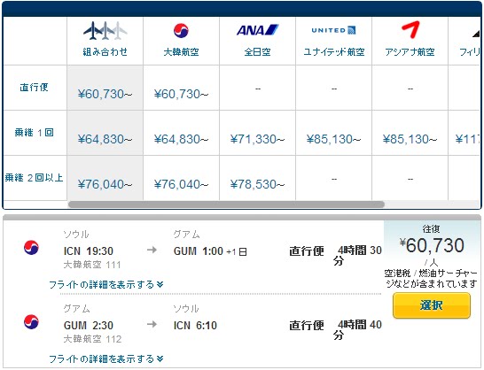 | 大韓航空(インチョン~グアム) | 60,730円 |