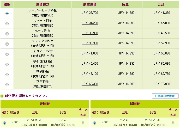 同じく大韓航空の10万810円のチケットでした。どうやら、この値段が、ゴールデンウィーク後半の東京~グアムの最安値と考えていいようです。