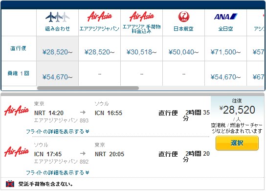 | エアアジアジャパン(成田~インチョン) | 28,520円 |