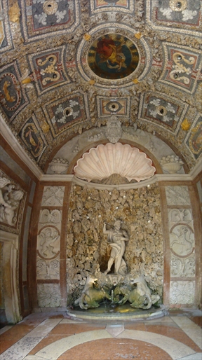 続いて、人工鍾乳洞のような部屋に案内されます。ここでも、至る所で不意をついてピュッピュッと水が飛んできます。ここの主は、人を驚かせるのが相当好きだったようですね。