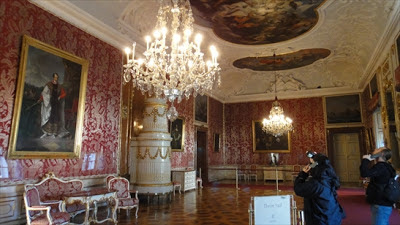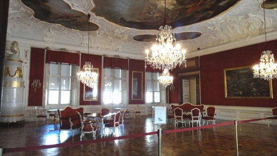 会議の間。豪華なシャンデリアに照らされ、赤でまとめられたこの部屋で、モーツァルトは初めて大司教の前で演奏したのだとか。