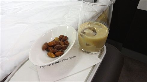 まずは、搭乗してすぐにウェルカムドリンクとナッツがサーブされました。ウェルカムドリンクには、好物のベイリーズをチョイス。シャンパンならおしゃれな写真になったかもしれませんが、やはり私はベイリーズが好きなのです(笑)。