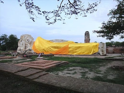 アユタヤのワット・ローカヤースッターでのこと。道に迷いつつも、なんとか涅槃仏にたどり着いてお参りをしようとしたところ、どこからともなく60代くらいのおばさんが現れました。どうやら、参拝の仕方を教えてくれるらしいのです。ここは、おばさんの言うとおり上座部仏教のしきたりに従って参拝しなければいけないと思い、言われるがまま線香や花を供えました。