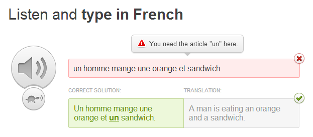 1問ずつ、短い問題が出題されます(これはウェブ版のフランス語の問題の一例です)。英語訳を解答欄に入力しCheckをクリックすると、正誤が判定されます。わからない単語がある場合は、カーソルをその単語の上に持って行くと意味がポップアップされます。また、左の音声ボタンをクリックすれば、フランス語の朗読音声も流れます。