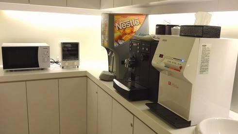 ▲ラウンジの奥には、フリードリンクのコーナーが!真ん中の自動コーヒーメーカーで作られる淹れたてのコーヒーは、非常に美味でした。電子レンジ等もあるので、お弁当を買ってきて温めなおしてからラウンジで頂いたりも出来ますね。