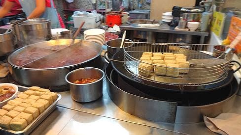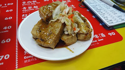 そして出てきました!台湾名物臭豆腐!豆腐を発行させたものらしいのですが、これが本当に臭いんです。鼻が曲がる臭さ。初めてこの匂いを嗅いだ時は、脳天を揺さぶられました(笑)。