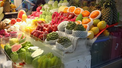 こちらのお店はくだものやさん。マンゴーやスイカ、パイナップルに、パッションフルーツ?ドリアン?