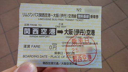 すると発券されたのが、こちらのチケットです。「無料乗継」とか、「0円」とか、律儀に書いてあります。降機してから急いだものの、16:35発のリムジンバスにギリギリ間に合いました。伊丹空港に向かってGO!