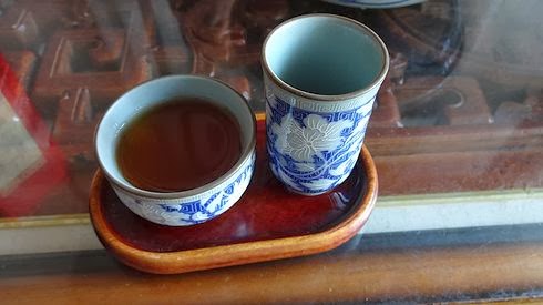 で、こちらが鉄観音の茶葉で入れたお茶です。いい色。右側の縦長の器は、お茶の香りを楽しむためのもの。色、香り、味のすべてを楽しもうという中国茶のスタイルです。