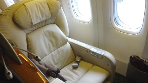 搭乗開始時刻までラウンジでくつろいだあと、機内に乗り込みました。こちらがファーストクラスのシート。B777に2-2-2のアブレストで配置されています。足元も広々。