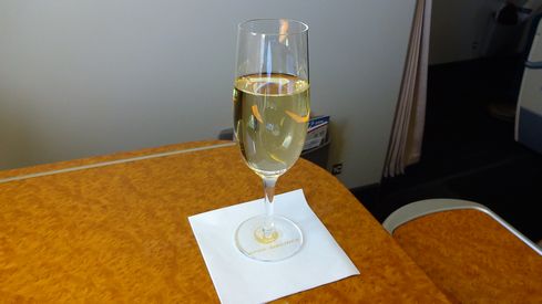 搭乗してしばらくするとメニューカードが配られました。飲み物をどうするか聞かれたので、シャンパンをオーダー(笑)。