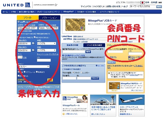 1. まずユナイテッド航空のトップページにアクセスしましょう。右側の黄色い欄に、マイレージ会員番号とPINコード(暗証番号)を入力し、ログインします。続いて左側の検索窓に、特典航空券で予約したいチケットの条件を入力しましょう。上から順に往復/片道、出発地、到着地、往路出発日、復路出発日、人数などを入力します。そして最後に、「特典旅行」にチェックを入れ、「検索」をクリックしましょう。