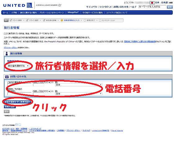 続いて電話番号を入力します。ここまで入力が完了したら、「座席を選択せずに処理を続行」をクリックしましょう。座席選択は予約完了後でもできますので、先に予約を済ませてしまいましょう。