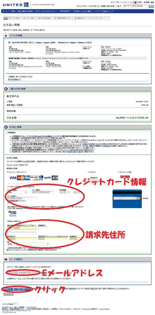 支払い情報の入力画面が表れます。こちらが最終確認画面になりますので、フライトや搭乗者名、必要マイル数や諸経費を確認し、下へスクロールします。