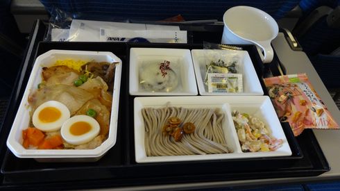 機内食は、豚肉がのったライスと、そば、饅頭などでした。不味くはないけれど、飛び抜けて美味しいわけでもないという、微妙な感じ。
