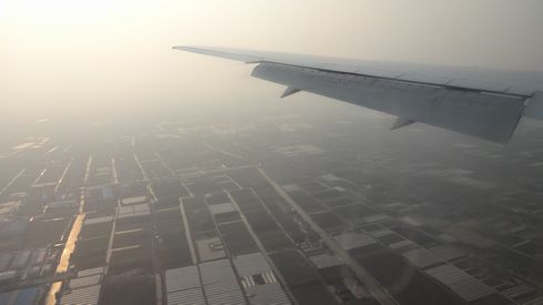 飛行機は上海上空で高度を下げていきます。PM2.5の影響で、辺り一面が白くモヤがかかり、遠くまで見通せません。中国の大気汚染の洗礼を受けたわけですが、後日訪れた深センや北京の状況は更にひどいものでした。これについてはまた改めて。