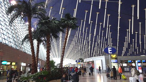 こちらは第1ターミナルのチェックインロビー。なんと、この大空間には通常の柱が一本もありません。その代わり、張り巡らされたワイヤーから伸びる多数の白い支柱が天井を支えています。先端恐怖症の人にとっては、ちょっと怖いかも。