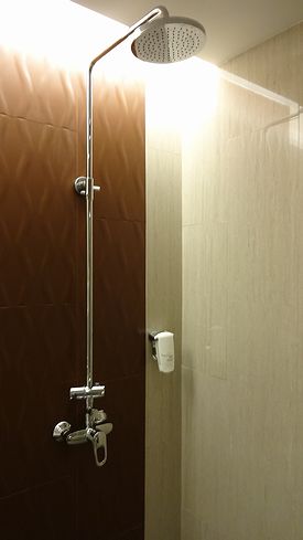 シャワーはヘッド固定タイプのレインシャワー。日本では一般的なハンドシャワーは備え付けられていません。慣れないと、なかなか体を洗いにくいですよね。