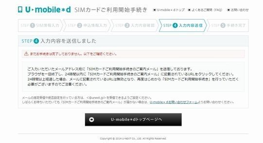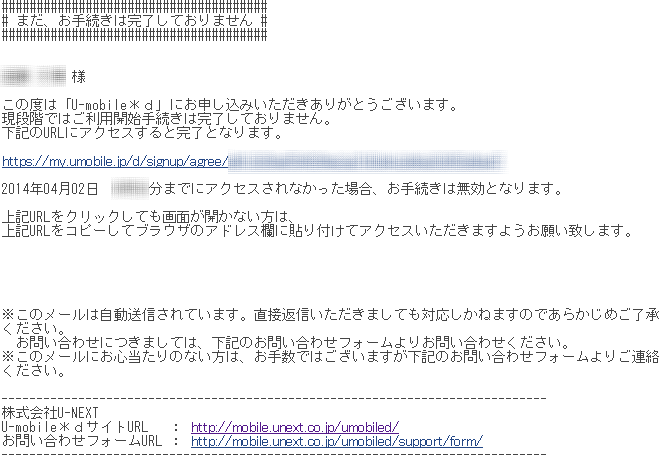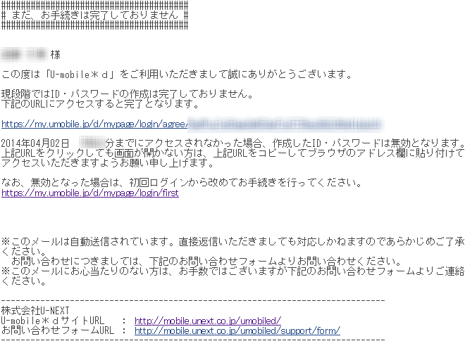 5. 「U-mobile*d自動応答メール」からの「SIMカードご利用開始手続きのご案内【U-mobile*d】」という件名のeメールが、無事届いていました。メールを開き、指示の通り、URLをクリックしましょう。