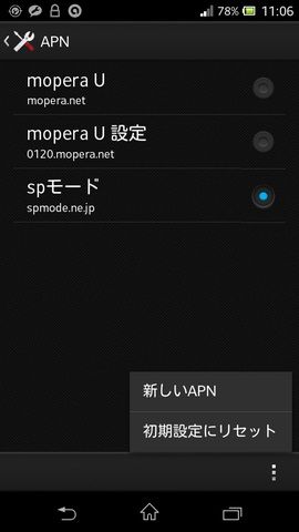 17. 「設定」→「その他の設定」→「モバイルネットワーク」→「アクセスポイント名」と順にタップすると、「APN」画面が現れます。右下のメニューボタンをタップすると、「新しいAPN」がポップアップしてきますので、これをタップしましょう。