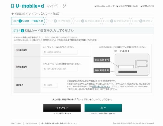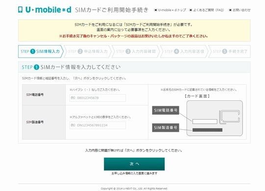 1. まず、SIMカード利用開始手続きを行い、SIMカードをアクティベートしましょう。パソコンなどからhttp://umobile.jp/dsにアクセスし、カードの裏面に書いてある「SIM電話番号」、「SIM製造番号」を入力し、「次へ」をクリックします。