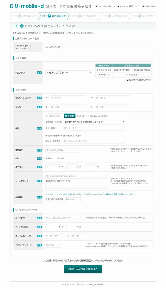 2. 料金プランを「スタンダードプラン」または「ダブルフィックスプラン」のどちらかから選択し、個人情報や、支払いクレジットカード番号を入力、「お申込み内容確認画面へ」をクリックします。