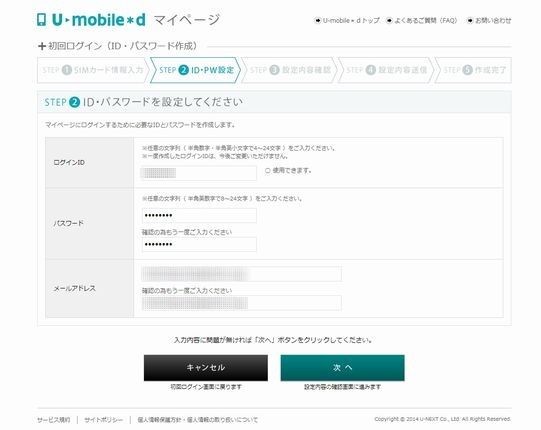8. IDとパスワードの設定画面が出てきます。自分の好きなIDとパスワード、そしてメールアドレスを入力し、「次へ」をクリックします。