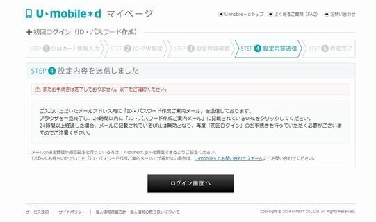 6. すると、この画面が表示されるはずです。これでSIMは通信可能となりました。続いて「初期ログイン画面へ」をクリックし、「マイページ登録」に進みましょう。