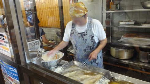 一人黙々とちくわ天を揚げるおばちゃん。手際よく天ぷらを揚げていくのですが、注文が多いためなかなか追い付きません。