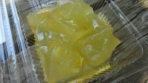 お分かり頂けるでしょうか、わらび餅の中にはっさくのエキスと皮が練り込んであるんでよ!何もかけずにこのまま頂くと、はっさくのさわやかな香りが口の中いっぱいに広がります。一気に疲れが吹き飛びますよ。