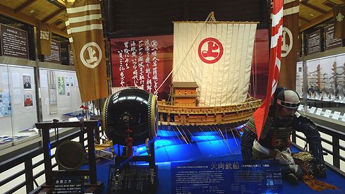 展示室は、当時の水軍の様子を再現した大型の模型を中心に、壁際に貴重な資料が並べられています。