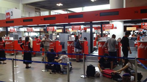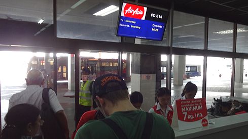 ドンムアン空港はタイ・エアアジアがハブ空港として利用しており、エアアジアのチェックインカウンターがずらっと並んでいます。しかし私は既にウェブチェックインを済ませ搭乗券をプリントアウトしていましたので、チェックインの行列を華麗にスルーし、直接保安検査場へ向かいます。