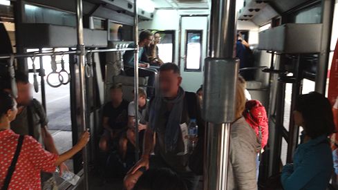 内部はほとんど立ち乗りですね。一部に腰を掛ける場所はあるのですが、数名分しか用意されていません。