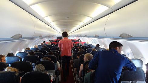 座席間隔はご覧のとおり、日本国内のLCCとほぼ変わりません。両脇が、どちらも欧米の大柄な男性で、彼らには窮屈そうです。