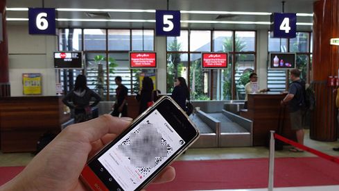 さて、搭乗手続きをしましょう。私は搭乗前の手間を省くために、事前にスマートフォンアプリでチェックイン済み。バーコード画面を端末に読み込ませれば、搭乗券が発券されるのですが、シェムリアップ空港にはその端末がありません!