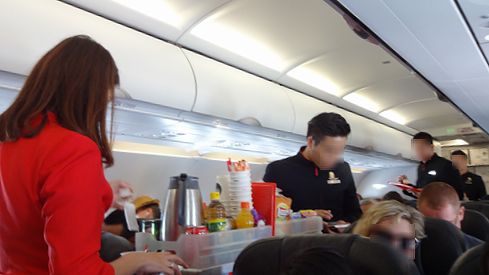 今回のフライトは、4人のCAさんのうち、なんと3人が男性でした。こういうのってエアアジアでは珍しくないのでしょうね。JALやANAだと、CAさんはほとんどが女性、国内LCCでも男性CAが増えてきたとはいえ、依然としてCAの圧倒的多数が女性であることを考えると、とても新鮮に感じられます。それに、エアアジアの男性CAの制服って、学ランみたいでちょっと格好良いんですよ。私もエアアジアのCAを体験してみたいかも(笑)。