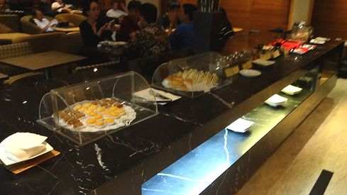 もちろんホットミールも用意されています。ドリンク類も、そこそこ。アルコールは、スタッフに頼んで持ってきてもらうシステムでした。もしかしたら有料なのかもしれません。イスラム教徒が多い国ですので、ビュッフェにはアルコールを置いておかないのでしょうね。