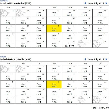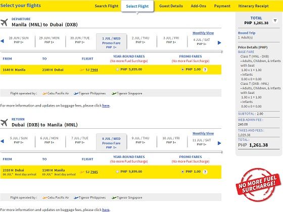 セブ・パシフィックのサイトで、マニラ⇔ドバイ往復を検索してみました。それがこちら。