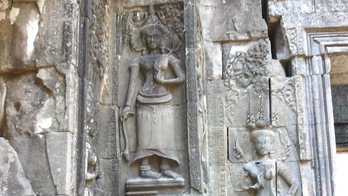 壁面に掘られたデバダー(踊り子)のレリーフも見事です。クメールスマイルが怪しげで魅力的。