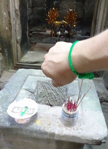 さて、中央祠堂には仏様が祀られていました。私、曲がりなりにも仏教徒ですので、お参りをしようとした所、異様にニコニコした尼さんがいきなり現れ、線香を私に手渡してきました。そしてそれに火をつけ、仏前に供えるよう薦めてくるのです。「これがここの参拝方法なのかな」などと思いつつ、言われるがまま線香を供えると、今度は尼さんの態度が急に変わり、いくらかお布施をするようにと迫ってきました。私は、その豹変ぶりにただただ唖然。結局は1ドルお布施をしたのですが、お金を受け取るやまた優しくなり、右手に緑色のミサンガのような紐を結んでくれました。