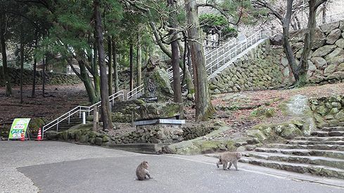 ちらほらニホンザルが現れはじめました。広場は、あの階段を上がったところにあります。