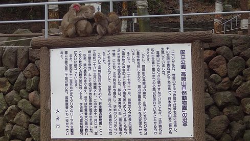 高崎山自然動物園の沿革を記した看板の上に、猿団子ができています。可愛いですねぇ。